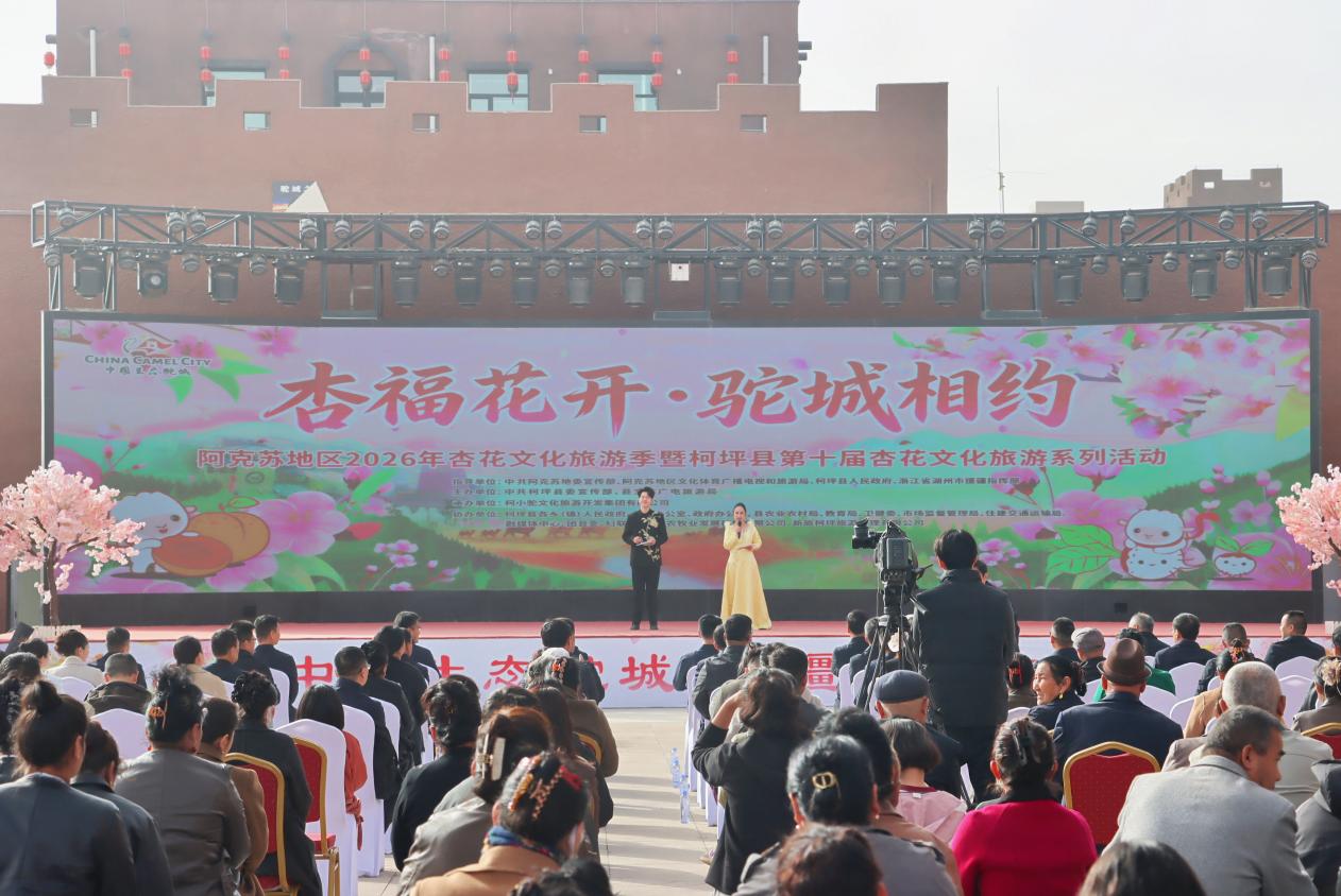 3月28日,伴随着精彩的歌舞表演,新疆阿克苏地区2026年杏花文化旅游季暨柯坪县“杏福花开·驼城相约”第十届杏花文化旅游系列活动在柯坪县启幕。