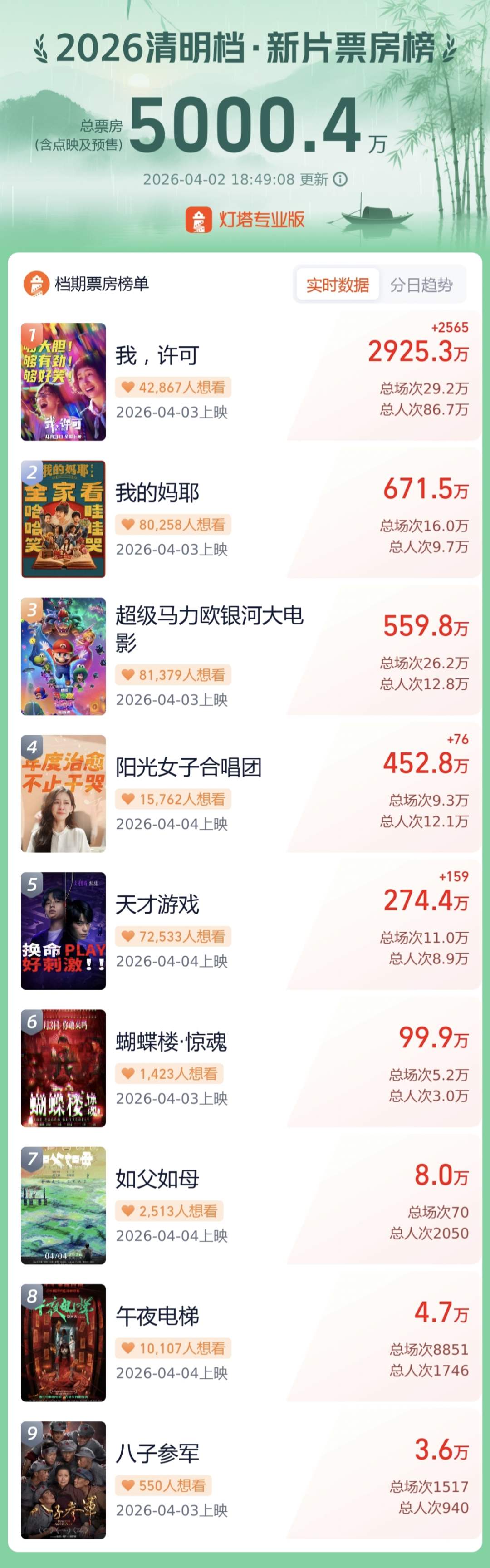 记者从灯塔专业版获悉,截至4月2日18时49分,2026年清明档新片点映及预售总票房突破5000万,影片《我,许可》《我的妈耶》《超级马力欧银河大电影》《阳光女子合唱团》《天才游戏》暂列前五。(经济日报记者 姜天骄)