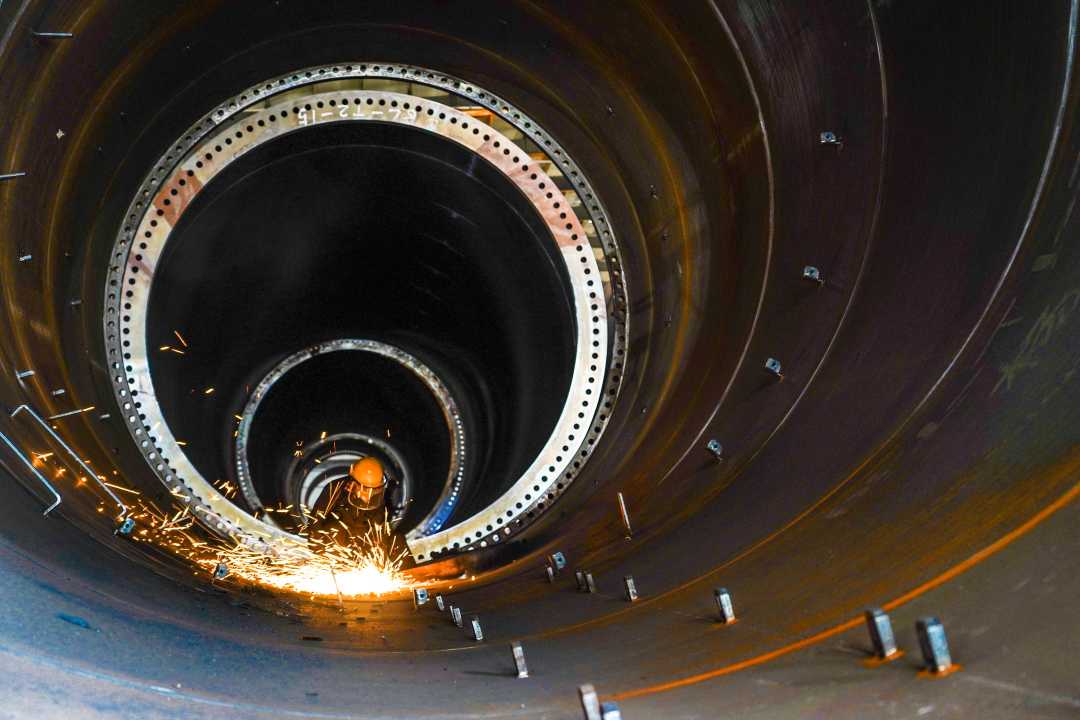 4月2日,在位于贵州省威宁自治县的贵州保龙设备制造有限公司风电塔筒生产车间内,工人在进行打磨作业。