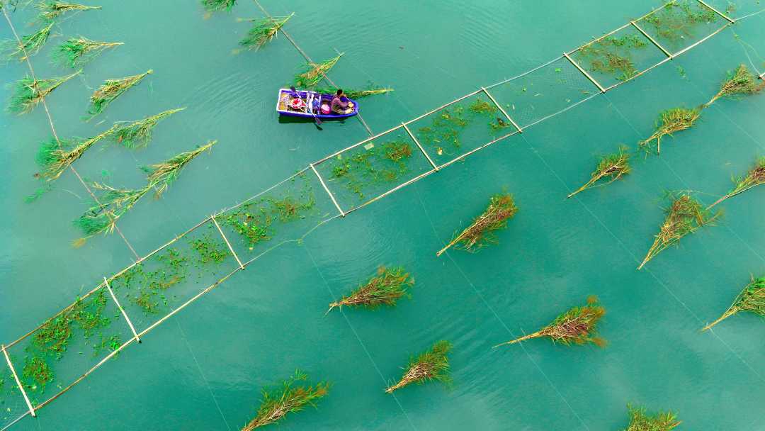4月2日,珠江干流西江广西梧州市区段,技术工人驾驶小艇管护人工鱼巢,保护珠江流域渔业资源