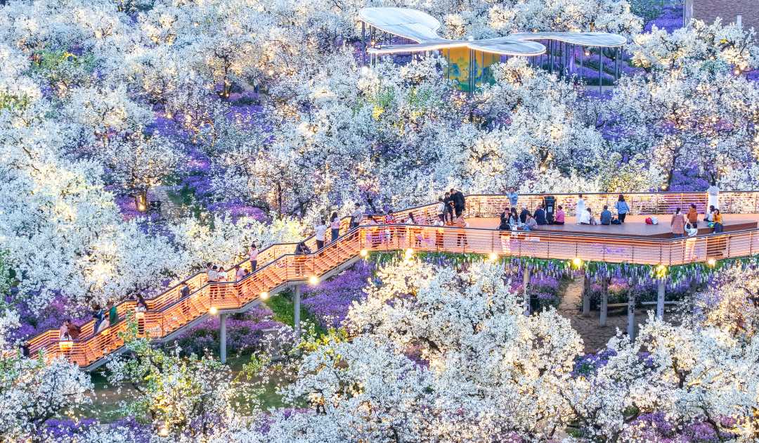 4月2日,游客在江苏省宿迁市湖滨新区三台山国家森林公园“梨兰会”景区踏青赏花,乐享春光。