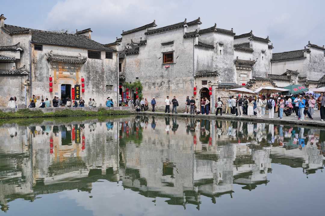 4月4日,安徽省黄山市黟县宏村景区迎来旅游高峰,众多游客赏景游玩,享受假期。