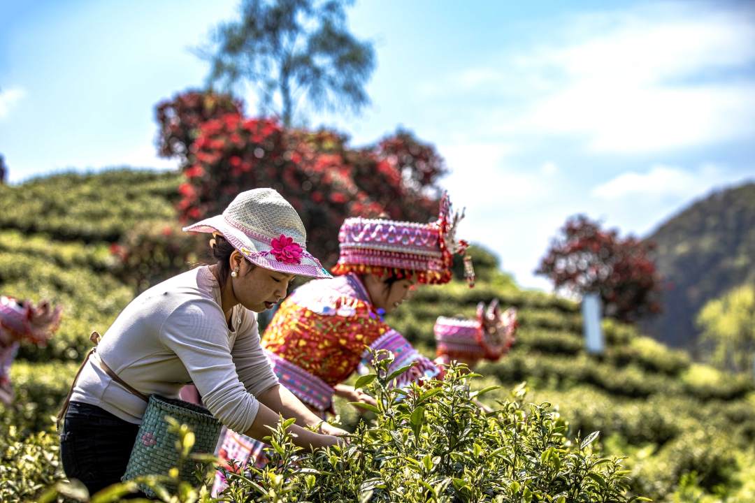 4月4日,茶农在贵州省毕节市金坡苗族彝族满族乡云崖天馨生态茶场采摘明前茶。