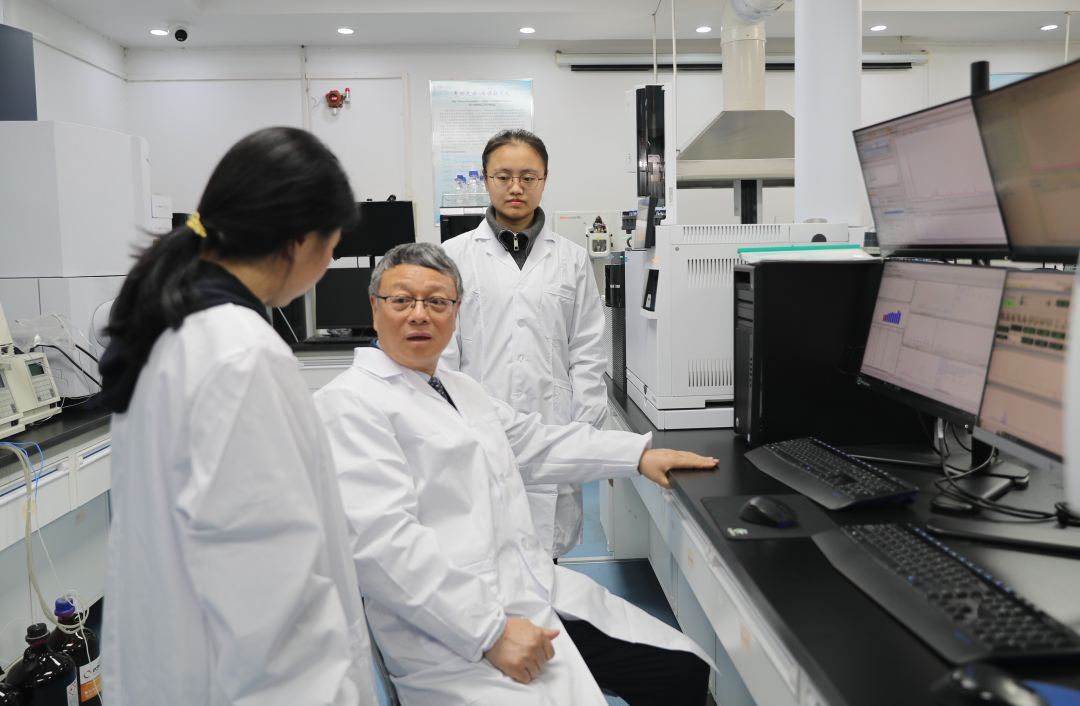西安交通大学能动学院的郭烈锦院士(左二)在绿色氢电全国重点实验室与团队成员研讨科研进展