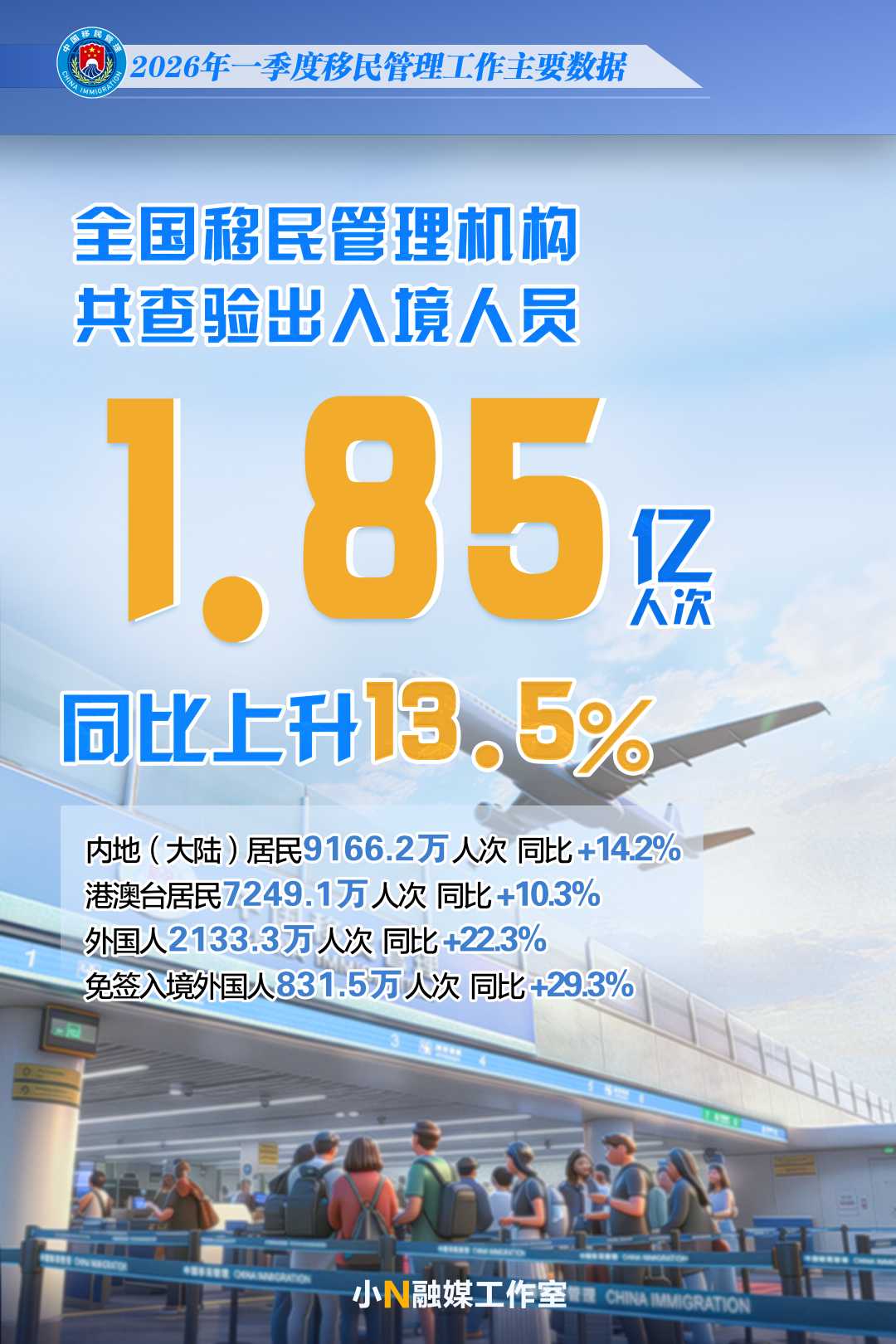 记者4月10日从国家移民管理局新闻发布会获悉,今年一季度,全国移民管理机构累计查验出入境人员1.85亿人次,同比上升13.5%;其中内地(大陆)居民9166.2万人次、港澳台居民7249.1万人次、外国人2133.3万人次,同比分别上升14.2%、10.3%、22.3%;免签入境外国人831.5万人次,占入境外国人77.9%,同比上升29.3%。