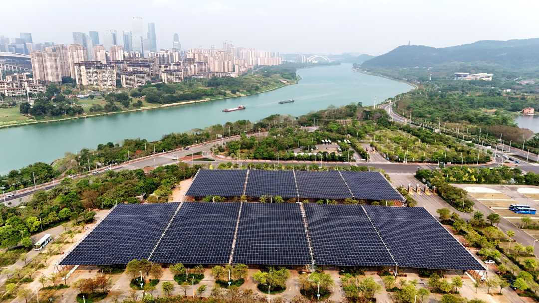 4月9日,广西壮族自治区南宁市青秀区一家企业利用停车场空间架设光伏设施,该设施可实现“棚顶发电、棚内停车”,助力城市绿色低碳发展。