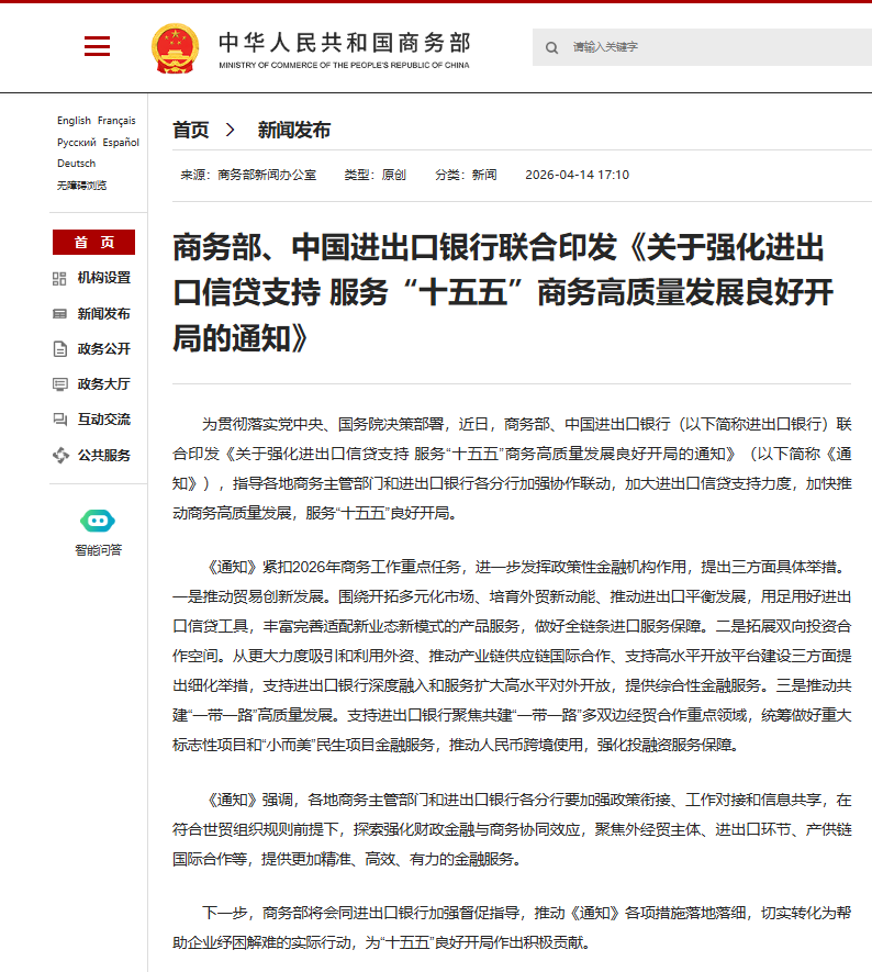 为贯彻落实党中央、国务院决策部署,近日,商务部、中国进出口银行(以下简称进出口银行)联合印发《关于强化进出口信贷支持 服务“十五五”商务高质量发展良好开局的通知》(以下简称《通知》),指导各地商务主管部门和进出口银行各分行加强协作联动,加大进出口信贷支持力度,加快推动商务高质量发展,服务“十五五”良好开局。