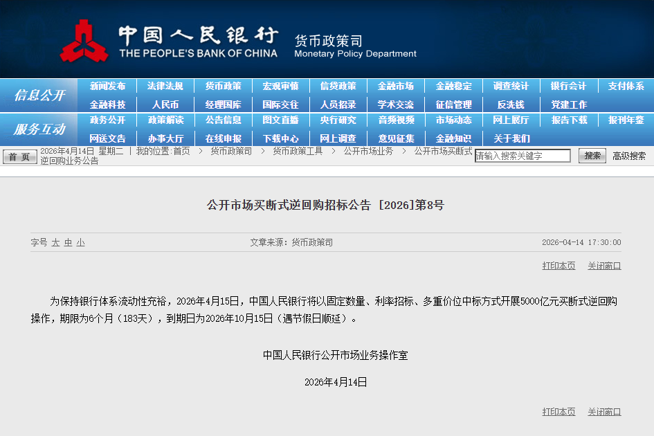 4月14日,央行公告称,为保持银行体系流动性充裕,2026年4月15日,中国人民银行将以固定数量、利率招标、多重价位中标方式开展5000亿元买断式逆回购操作,期限为6个月(183天),到期日为2026年10月15日(遇节假日顺延)。