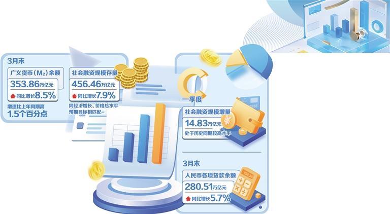 中国人民银行最新数据显示,3月末,广义货币(M_2)余额353.86万亿元,同比增长8.5%,增速比上年同期高1.5个百分点;社会融资规模存量456.46万亿元,同比增长7.9%,同经济增长、价格总水平预期目标相匹配。一季度,社会融资规模增量为14.83万亿元,处于历史同期较高水平。与此同时,贷款规模保持合理增长,信贷结构持续优化。3月末,人民币各项贷款余额280.51万亿元,同比增长5.7%。