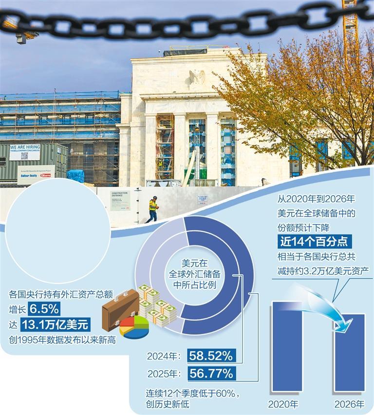 国际货币基金组织(IMF)日前公布的数据显示,2025年各国央行持有的外汇资产总额增长了6.5%,达到13.1万亿美元,创下自1995年国际货币基金组织提供相关数据以来的历史最高纪录,但美元在全球外汇储备中所占比例却从2024年的58.52%降至56.77%,在连续12个季度低于60%的同时创下历史新低,相较2001年72%的储备占比峰值,下滑幅度超过15个百分点。从2020年到2026年,美元在全球外汇储备中的份额预计下降近14个百分点,相当于各国央行总共减持了约3.2万亿美元的资产。
