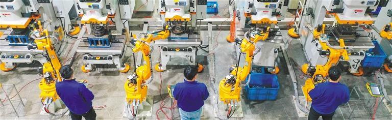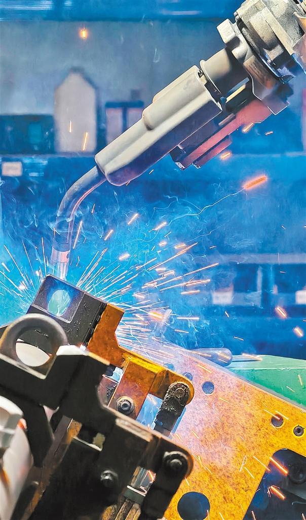 4月11日,安徽省六安高新区友邦散热器(安徽)有限责任公司智能生产线,智能机械臂在焊接零部件。 胡吉林摄(中经视觉)