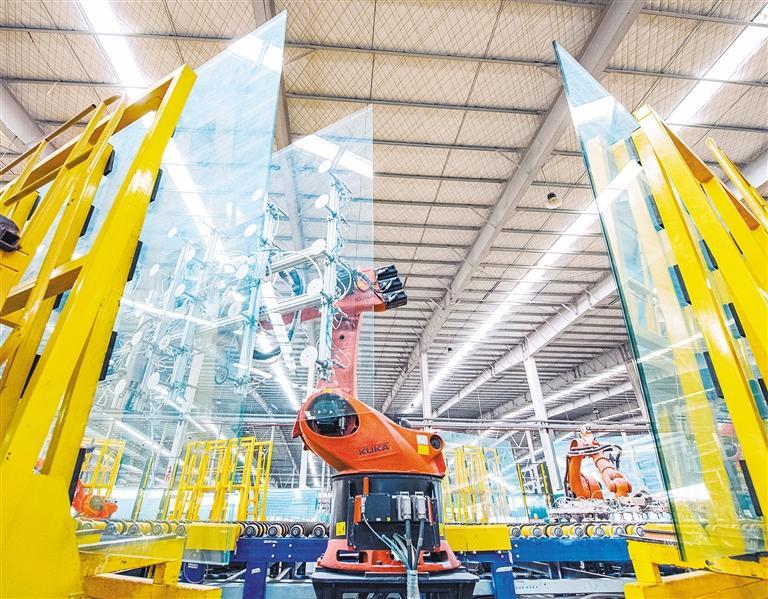 2025年11月12日,江苏省宿迁市宿豫区江苏苏华达新材料有限公司,浮法玻璃生产线机械手取片系统在自动堆垛玻璃。 徐江海摄(中经视觉)