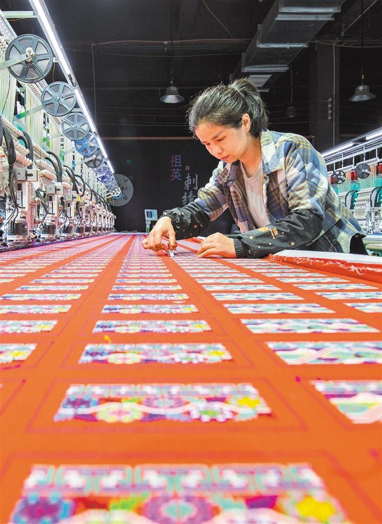 4月6日,工人在贵州省黔东南苗族侗族自治州从江县一数字化刺绣企业的生产车间内忙碌。 罗京来摄(中经视觉)