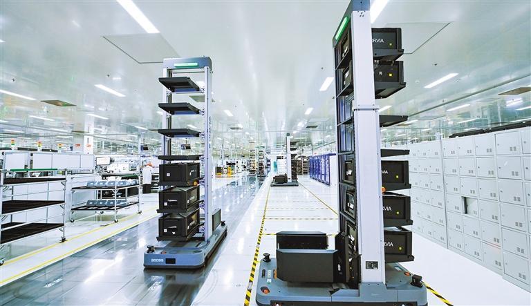1月13日,江西省丰城市佛吉亚歌乐电子(丰城)有限公司,AGV自动导引车在智能化车间运转作业。 周 亮摄(中经视觉)