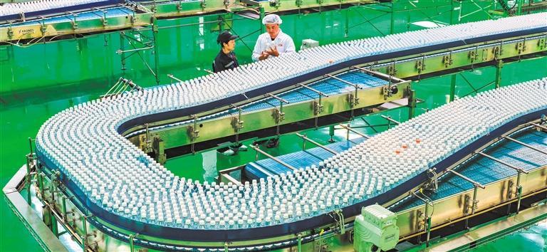 4月10日,山东省乐陵市汇源果汁数字化生产车间,技术工人在瓶装饮品自动生产线旁巡检。 贾 鹏摄(中经视觉)