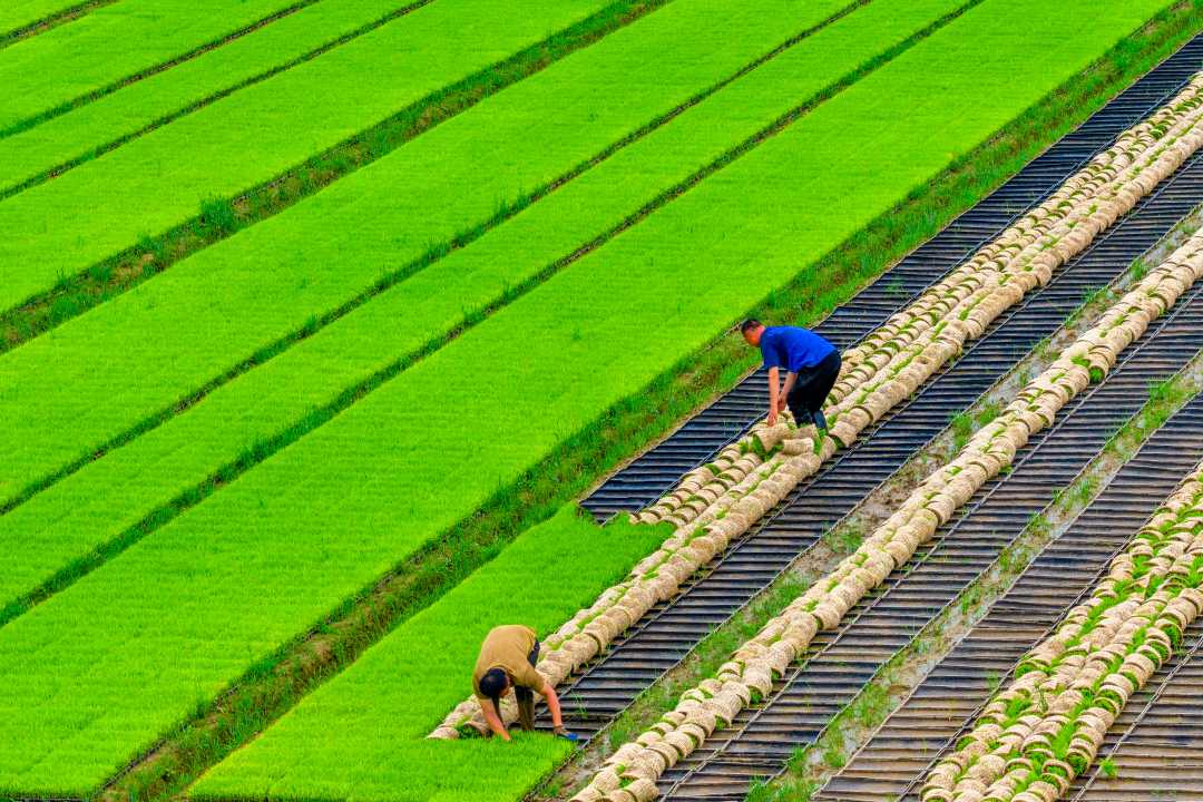 4月12日,浙江省嵊州市甘霖镇甲秀坂村永收家庭农场,村民将早稻秧苗分装、搬运至田间。
