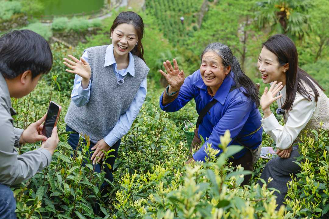 4月14日,安徽省黄山市歙县璜田乡蜈蚣岭村,主播通过“和美乡村直播间”帮助村民推介高山茶叶。