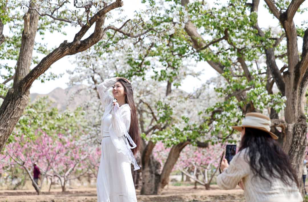 4月14日,游客在甘肃省兰州市皋兰县什川镇古梨园内赏花拍照。