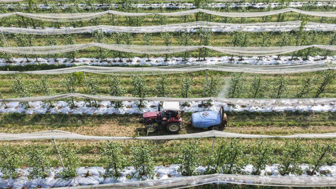 4月14日,山东省东营市广饶县大王镇一苹果种植基地,处于盛花期的苹果树花开艳丽,农民驾驶农机进行植保作业。