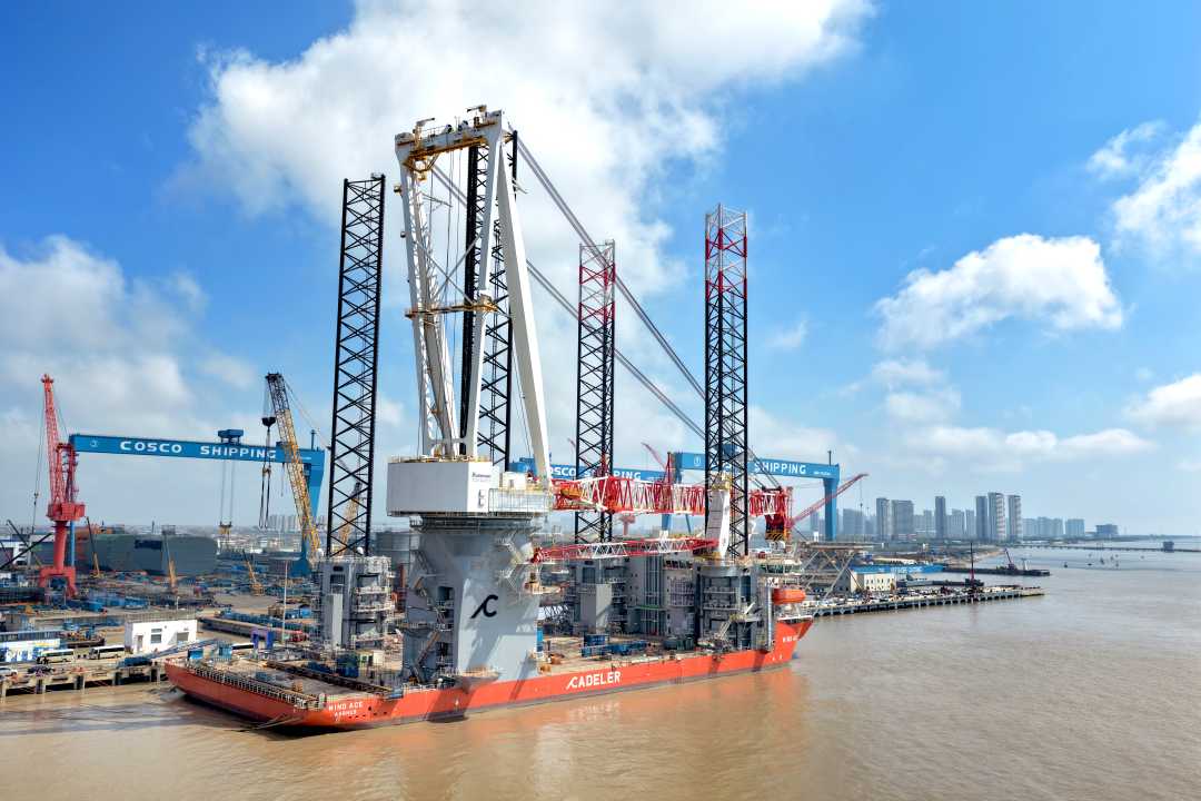 4月15日,启东中远海运海工为丹麦船东定制的NG20000型风电安装船建设现场。