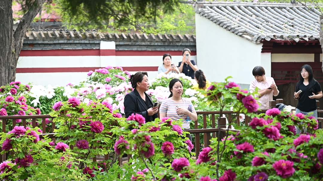 游客在汉牡丹园内欣赏盛开的牡丹花。杨佩 摄