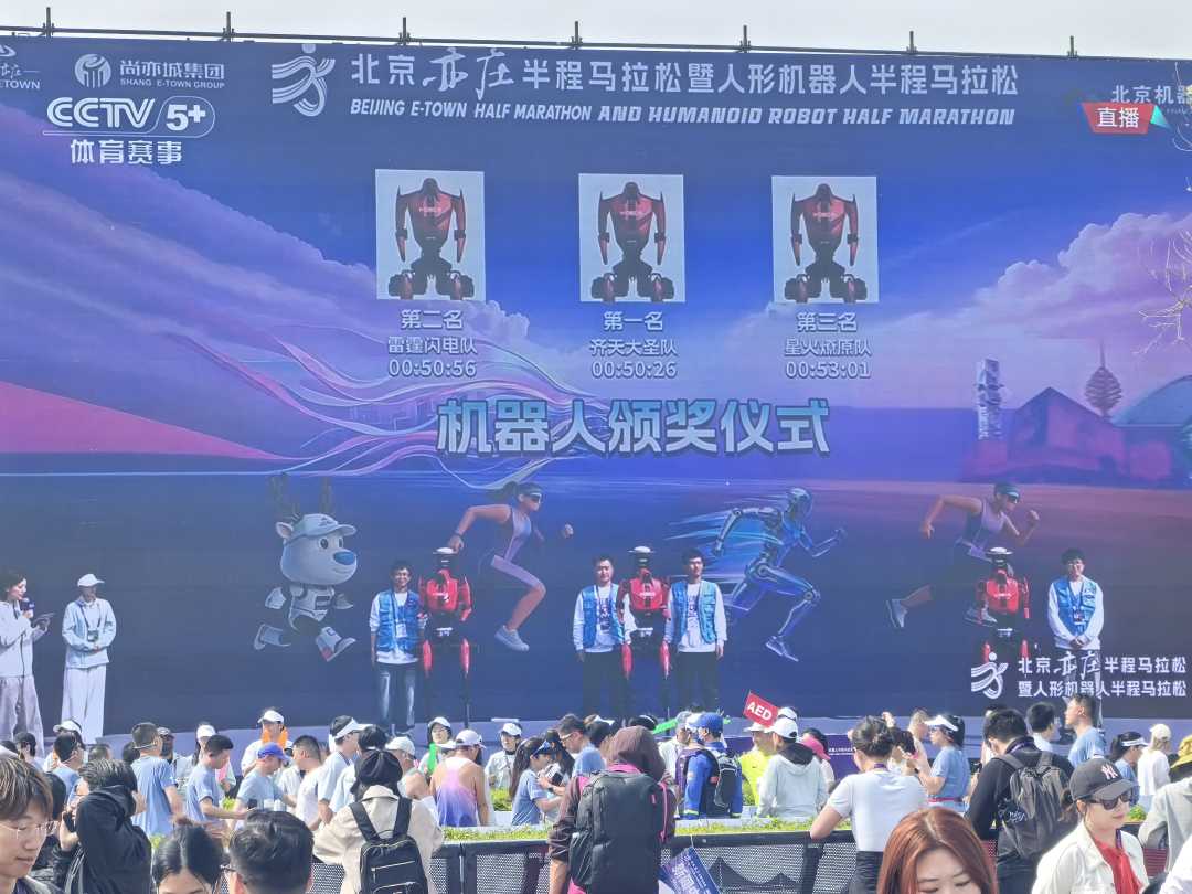 4月19日,2026北京亦庄人形机器人半程马拉松赛场上,齐天大圣队、雷霆闪电队、星火燎原队分别夺得冠军、亚军、季军,净用时分别为50分26秒、50分56秒、53分01秒。