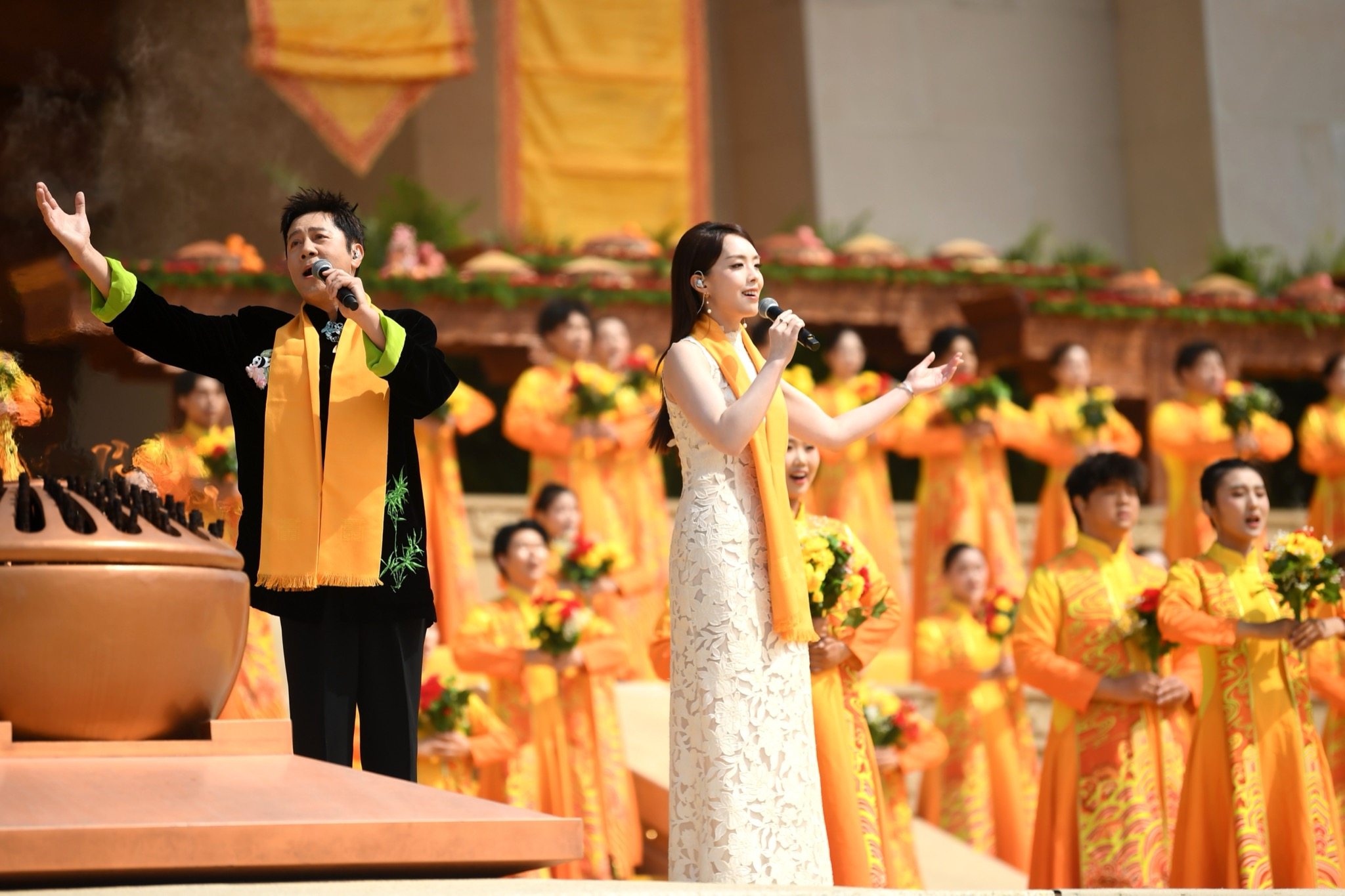 来自内地、香港、澳门、台湾的歌手,与少年儿童齐唱《黄帝颂》、共话同根缘。随后,舞蹈演员身着古装,随着浑厚的鼓乐在台上翩翩起舞,以乐舞敬拜先祖,再现华夏礼乐的庄重与典雅。