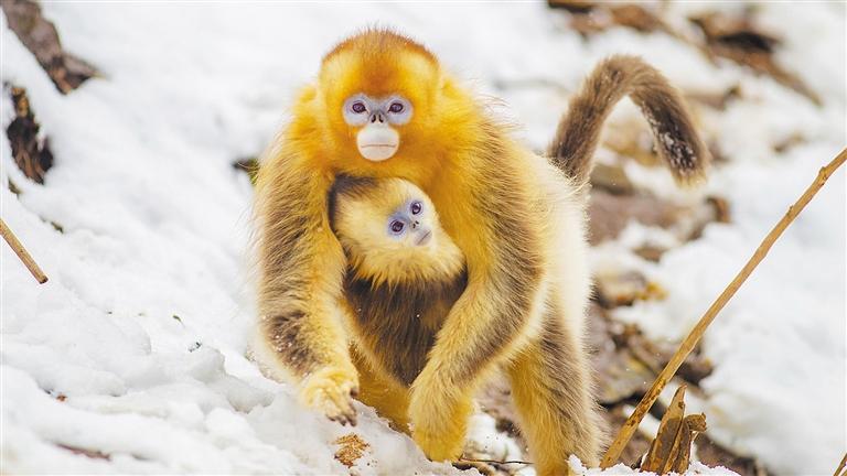 2月24日,四川省绵阳市平武县黄羊关,川金丝猴母子下山觅食。今年4月22日是第57个世界地球日,活动主题为“珍爱自然资源 守护美丽中国”。田明章摄(中经视觉)