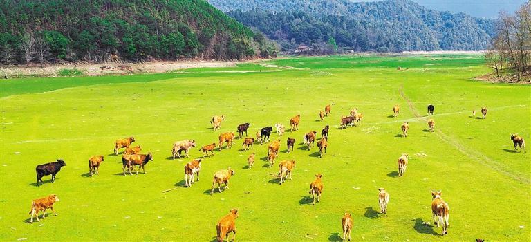 3月10日,江西省泰和县桥头镇南车水库,成群的黄牛在草地上悠闲觅食。邱联桂摄(中经视觉)