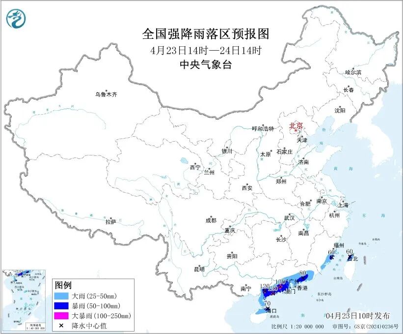 ■中央气象台23日发布暴雨蓝色预警:23日14时至24日14时,广东南部、海南岛北部、福建东南部、台湾岛西北部等地部分地区有大到暴雨,其中,广东西南部局地有大暴雨。上述部分地区伴有短时强降水,局地有雷暴大风等强对流天气。