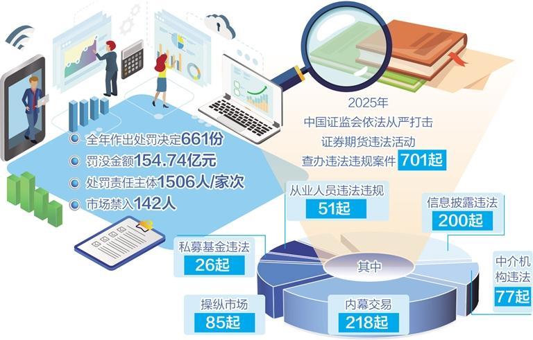 2025年,中国证监会依法从严打击证券期货违法活动,查办违法违规案件701起。其中,信息披露违法案件200起,中介机构违法案件77起,内幕交易案件218起,操纵市场案件85起,私募基金违法案件26起,从业人员违法违规案件51起。